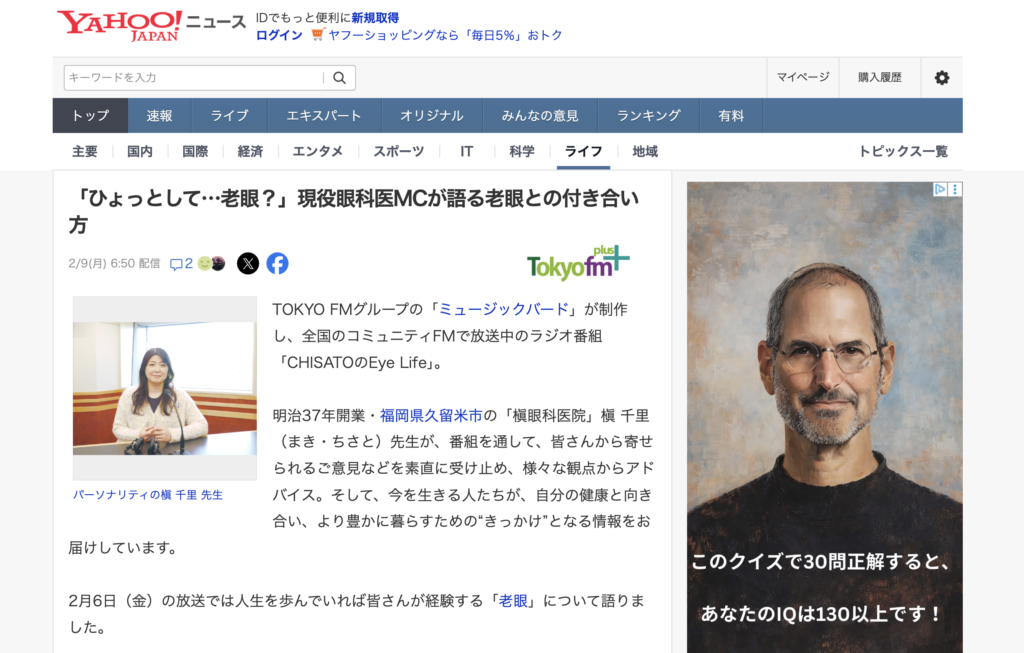この度、ラジオで『老眼』をテーマに話し、Yahoo! JAPANでも掲載されました。